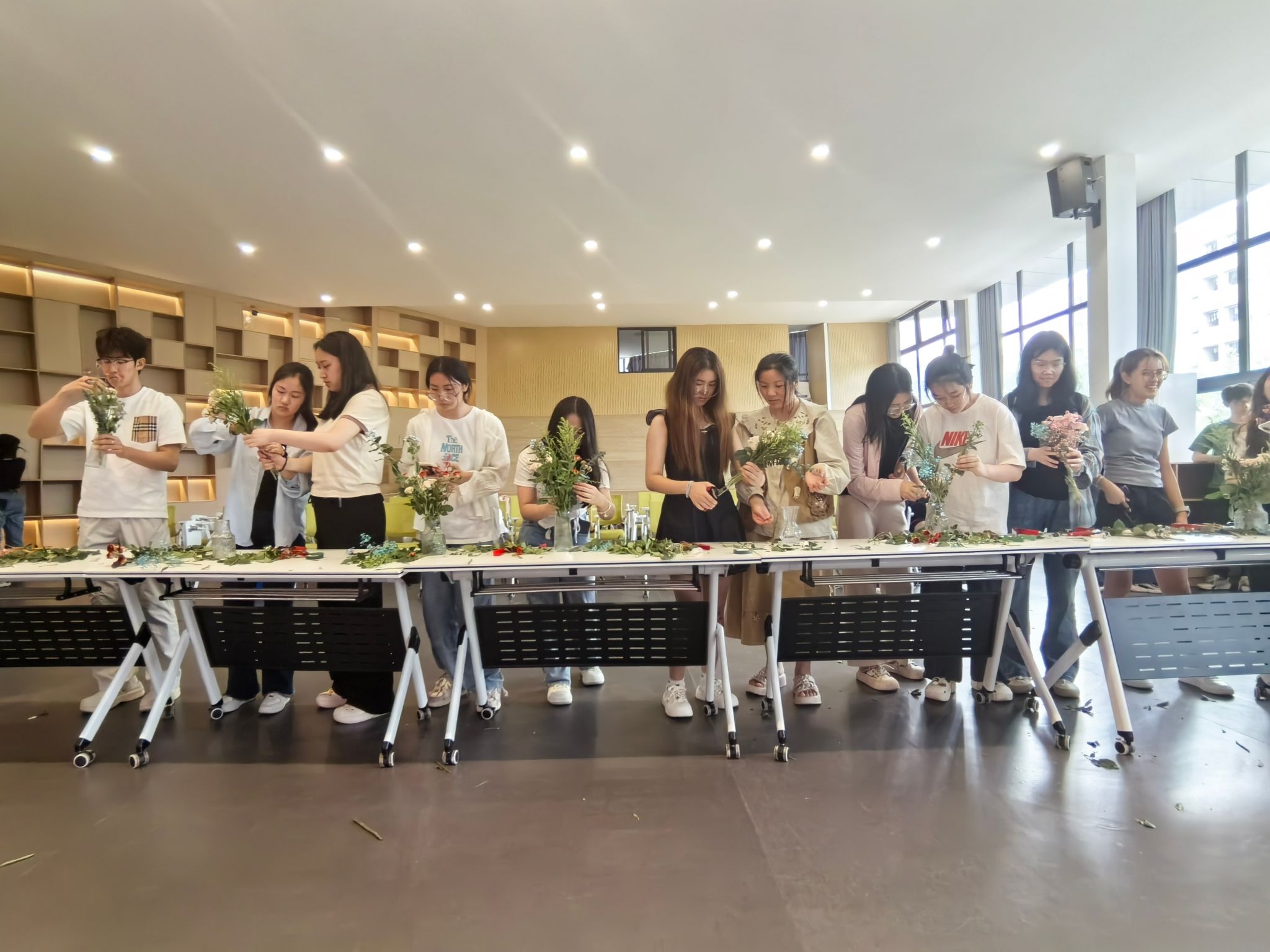 活动下半场,学校第25届研究生支教团巫山小分队队长、pa视讯官方集团2024级风景园林硕士研究生吴佳应带领同学们走进“插花艺术课堂”。她曾将花艺带到库区小朋友的身边,以花枝为笔,为乡村振兴写下温润的旁白。参加沙龙活动的同学们纷纷走到台前,发挥自己的想象开始了“插花秀”,彼此交流心得,分享创作灵感,沉浸在亲手创作的乐趣和插花艺术带来的快乐中,现场欢声笑语。“乡村振兴”的无形语言凝为可见可感的艺术作品。