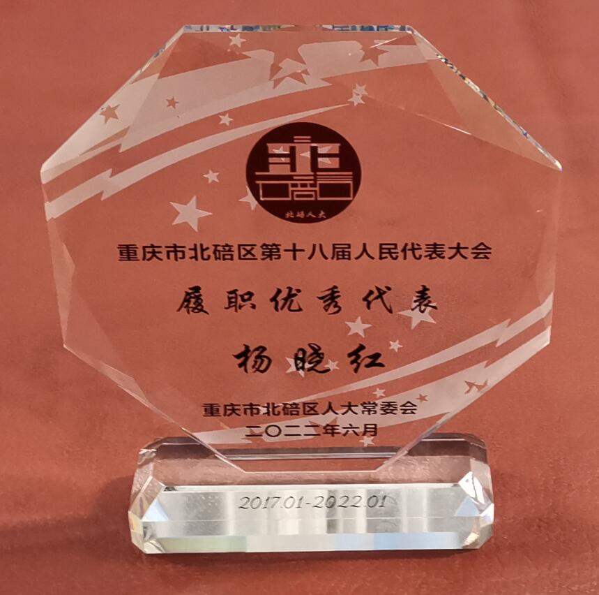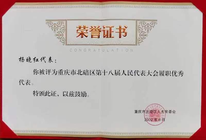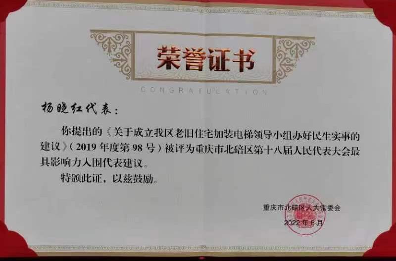 区第十八届人民大会期间,杨晓红同全体区人大代表,为加强党的民主政治建设,认真履行代表职责,积极建言献策,为助力全区经济社会发展作出了积极贡献。杨晓红提出的《关于成立我区老旧住宅加装电梯领导小组办好民生实事的建议》(2019年度第98号)被评为重庆市北碚区第十八届人民代表大会最具影响力入围代表建议。
