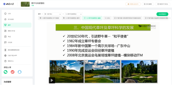 《草坪与地被植物》是一门伴随着农业科学发展而发展的生产应用型学科,该课程在经过多年的线下教学实践后,于2020年11月在中国大学MOOC(慕课)平台正式上线,面向全体高校在校生和社会从业者及学习者开放,受众面广,至今选课人数已达2000余人。该课程针对线上学习者的特点和要求,基于“模块化教学”和“三元融合”理念,开展教学模式设计,将家国情怀、中国传统文化、生态文明理念等课程思政元素与专业知识融会贯通;紧跟学科发展前沿,不断补充和更新线上教学资源,有效提升了课程学习的高阶性、创新性和挑战度;通过网络平台打破了时间和空间的限制,授课教师与学习者充分互动,以学生为中心,满足了不同层次学习者的需求,同时课程利用在线大数据分析,及时跟踪教学效果,敦促课程持续改进,得到了较好的教学反馈和评价。2022年获批重庆市高校一流本科课程。