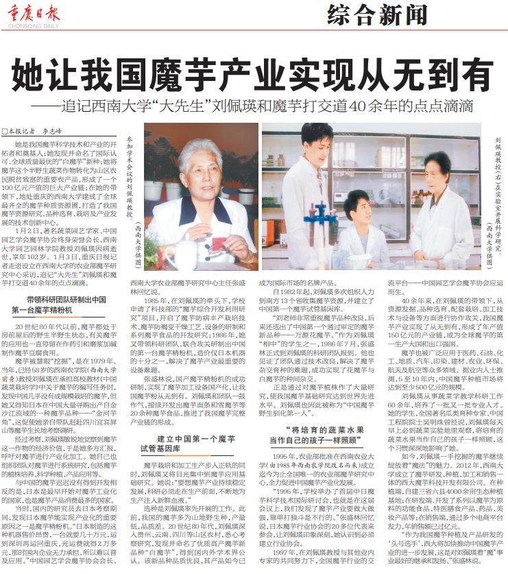 学院退休教授刘佩瑛先生,于2023年1月2日去世,享年102岁。刘佩瑛教授胸怀博大,学识渊博,师德高尚,深受同行和师生们的尊敬。她是魔芋科学技术和产业发展的开拓者和奠基人,其研究成果促进了中国魔芋产业的形成和发展,并为pa视讯官方集团,PA视讯登录入口的建设和发展做出了极其重大的贡献。刘佩瑛教授逝世是园艺领域的重大损失,但她在魔芋行业中的突出贡献依然被社会铭记。1月5日,重庆日报记者走进pa视讯官方集团,以《她让我国魔芋产业实现从无到有》为题,追记“大先生”刘佩瑛和魔芋打交道40余年的点点滴滴。全文报道如下:
