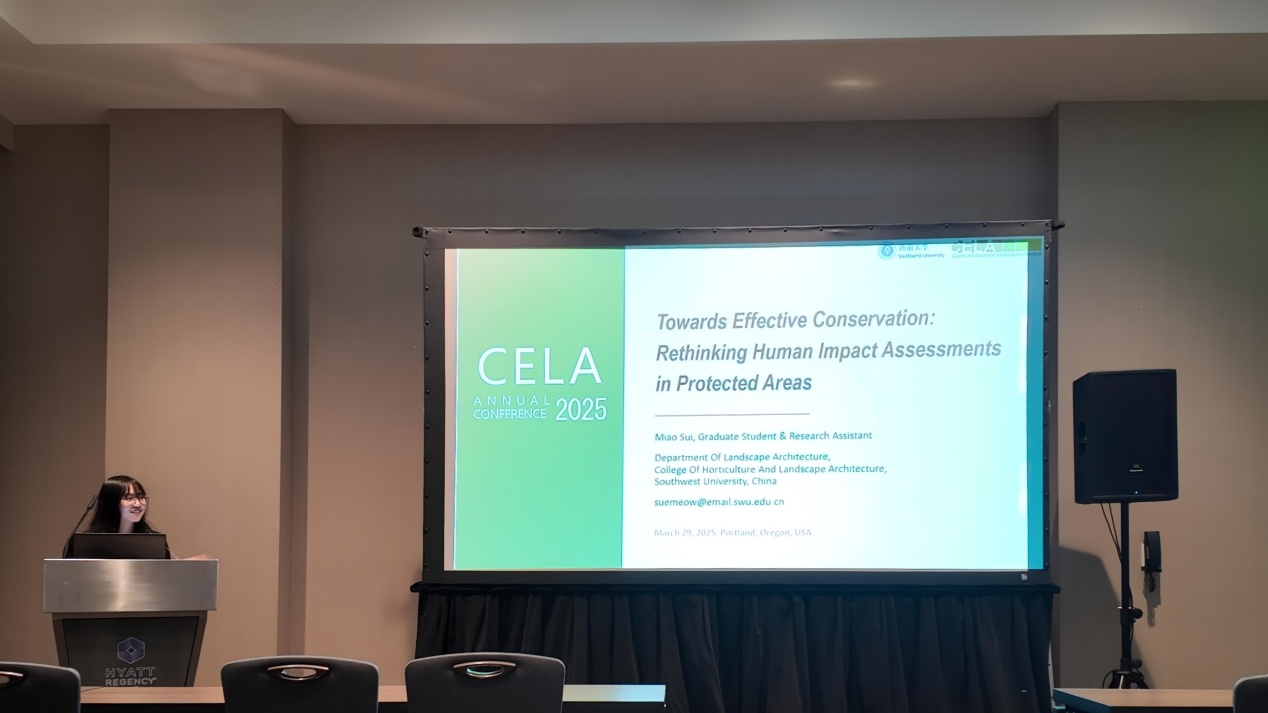 西南大学园艺园林学院杜文武教授指导的硕士研究生兼研究助理眭淼受邀参会,并在研究方法分会场(Research Methods Track)作了题为“Towards Effective Conservation: Rethinking Human Impact Assessments in Protected Areas”的主题报告。该研究深入探讨了自然保护地及其毗邻区人类活动影响评估方法的重要性与局限性,基于景观空间格局中的梯度模式(Gradient Model)和景观阻力(Landscape Resistance)原理提出了一种适用于自然保护地人类活动影响评估的新方法——人为压力梯度(Human Pressure Gradient)。此方法结合了直接的人类活动强度评估和间接的人类活动影响评估途径的优点,弥补了现有方法在揭示人类活动溢出影响、精细化空间异质性方面的不足,能够更精确地捕捉自然保护地中的人为压力风险,为自然保护地人类活动管理提供了新的思路,获得了与会者的一致好评。