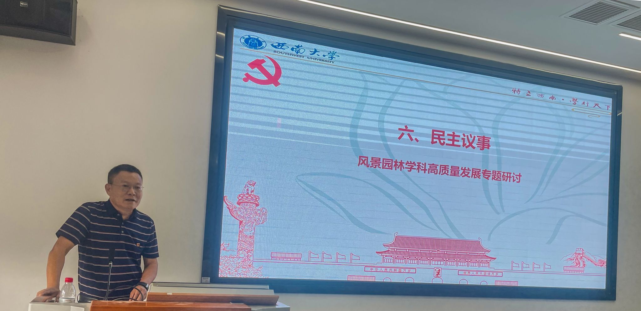 在民主议事环节,学院党委书记周建华,风景园林系主任杜文武,风景园林系副主任罗爱军聚焦风景园林学科高质量发展问题,分别以 “第十四届中国风景园林教育大会暨2025年全国风景园林专业学位研究生教育年会筹备情况”“坚持立德树人构建高质量博士培养体系”“党建引领专业发展:新专业与微专业的探索与实践”为主题进行了发言,聚焦学科建设与人才培养关键问题,提出具体思路与举措。秦华、马婧、孙松林三位同志围绕“新专业建设中存在的困难”“学科高质量发展解决方案”“如何加强师资队伍建设以提升教学质量”等方面展开热烈讨论,现场气氛活跃,思想碰撞充分。