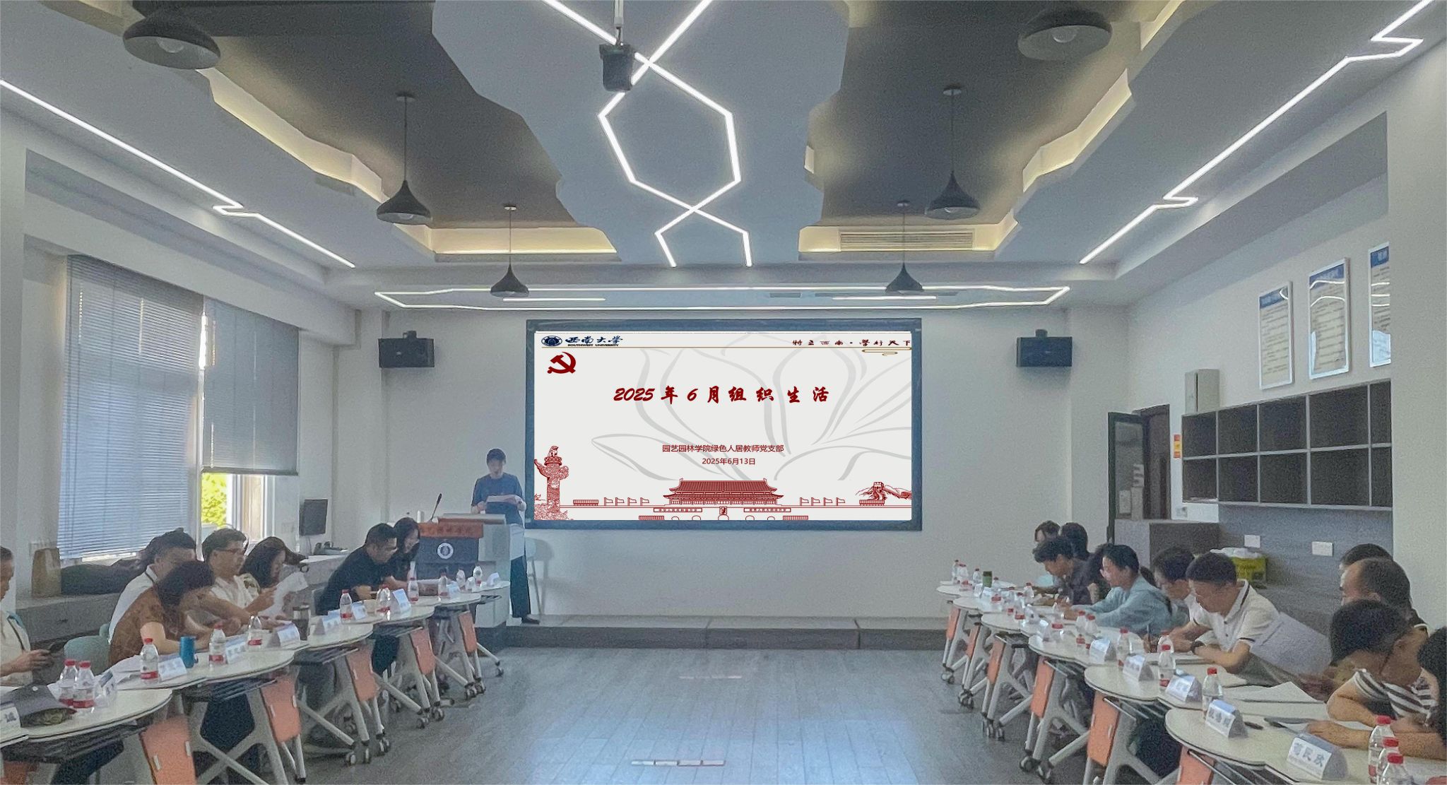 6月13日,学院绿色人居教师党支部在33教508室举行了6月组织生活。学校党委常委、副校长白显良出席并指导,学院党委书记周建华,党委委员、副院长郭启高,风景园林系主任杜文武、副主任罗爱军,以及支部全体党员、教师入党积极分子共同参加了本次活动。主题党日由党支部副书记吴雨浓主持。
