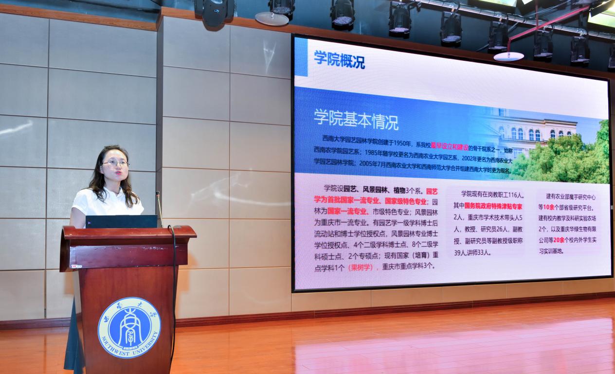 随后,学院副院长潘宇向新生及校友介绍学院的基本情况及近年来所取得的成果。学院自建院以来经历70余年的发展,园艺、园林、风景园林三个专业均为省部级一流专业建设点,其中园艺和园林专业为国家一流专业建设点,园艺专业为教育部特色专业。学院学科体系完善,园艺和风景园林学科均有博士学位授权点。“十四五”期间立项科研项452项,首次获国家重点研发项目资助(经费2700万元),获国家植物新品种权等20余项,科研成果丰硕,服务社会效果显著。学院将全力支撑新生成长与发展,祝愿所有艺林学子学有所成。