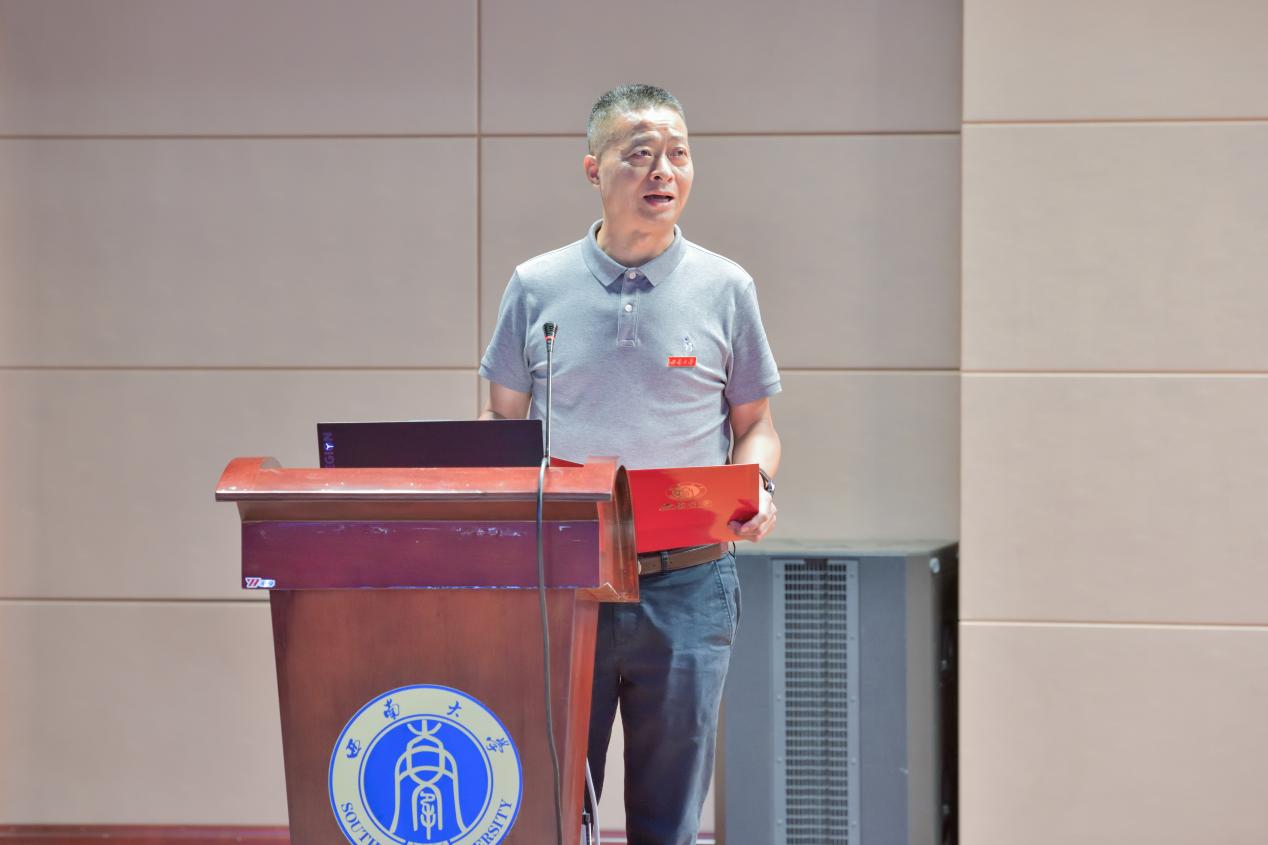 优秀校友代表受邀发言。重庆道合设计总经理邓仁俊学长结合设计从业经验分享职业发展心得。他指出园林属跨学科专业,在当下经济转型期,更可跨界文旅、科技、摄影等方向,并列举了校友成功案例。他勉励新生,面对学业压力无需埋怨,唯有扎实专业知识,才能实现深耕行业或跨界发展,最后祝愿新生学业生活顺利、前途壮丽。