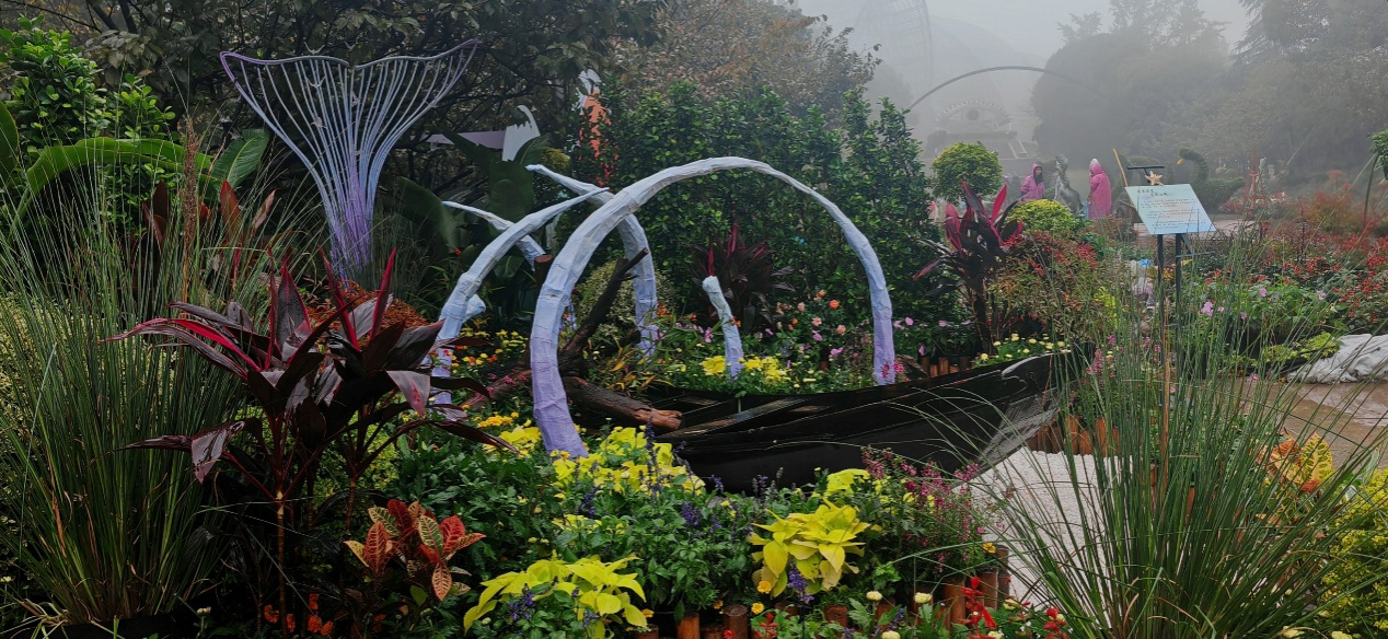 作品介绍:这方花境,以舟为骨,勾勒鲸落,繁花自此挣脱、奔涌、绽放,这是生命于沉淀之中的涅槃,更是山城重庆“坚韧、忠勇、开放、争先”的精神写照。轻舟与鲸落,铸就城的骨与魂——骨是山的坚韧,魂是海的浩瀚。于此,历史尘埃与当代潮音激荡出新生,如秋菊傲霜,旧枝绽新蕊。我们将这座城的韧性刻入花意——它承载千年,却向世界敞开;每一次“鲸落”,都为更绚烂的新生。沉“鲸”侧畔千帆过,生命永恒向前。