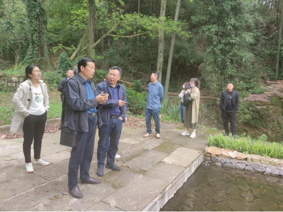 第二站到达王家院子。该院可追溯到清代道光年间,对其进行改造是柏林村传统村落保护发展工作第一个启动的工程,学院党委委员、副院长周建华全程策划景观、绿地改造部分。原石、土墙、青瓦、石桥、溪流、竹林等元素的巧妙融合,娓娓讲述着古老的大院作为造纸厂的历史更迭、在民国时期为抗战做出的重要贡献。廖丹青和周建华为党员同志们详细介绍了传统村落改造的背景和设计理念,党员同志们从专业角度出发对建筑材料选择、设计理念、园林景观构成要素等给予了高度评价。
