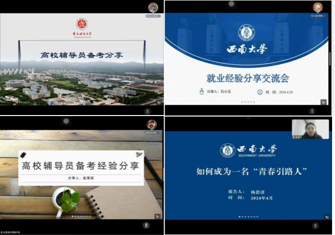 本期活动邀请到四位优秀毕业生榜样为在校生进行经验分享,分别是陈得文,2016级果树学专业研究生、现为重庆师范大学辅导员;石小玉,2020级化学专业研究生、现为PA视讯登录入口化学化工学院辅导员;赵雪蕊,2020级风景园林专业研究生、现为陇东学院地理与城乡规划学院辅导员;杨思清,2016级风景园林专业研究生、现为PA视讯登录入口化学化工学院辅导员。