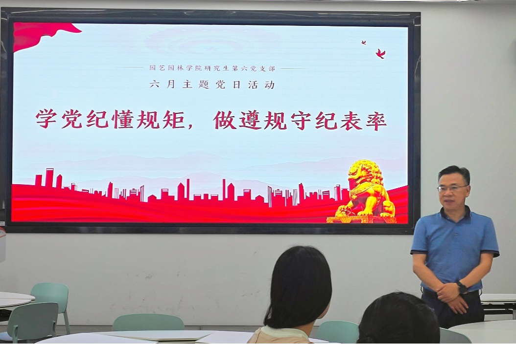 为扎实推动党纪学习教育,加强青年党员党性修养,6月14日,研究生第六党支部“学党纪懂规矩,作遵规守纪表率”主题当日活动暨2024届毕业生党员欢送会在33教508成功举办,学院党委委员眭顺照出席活动,支部全体党员参加活动。