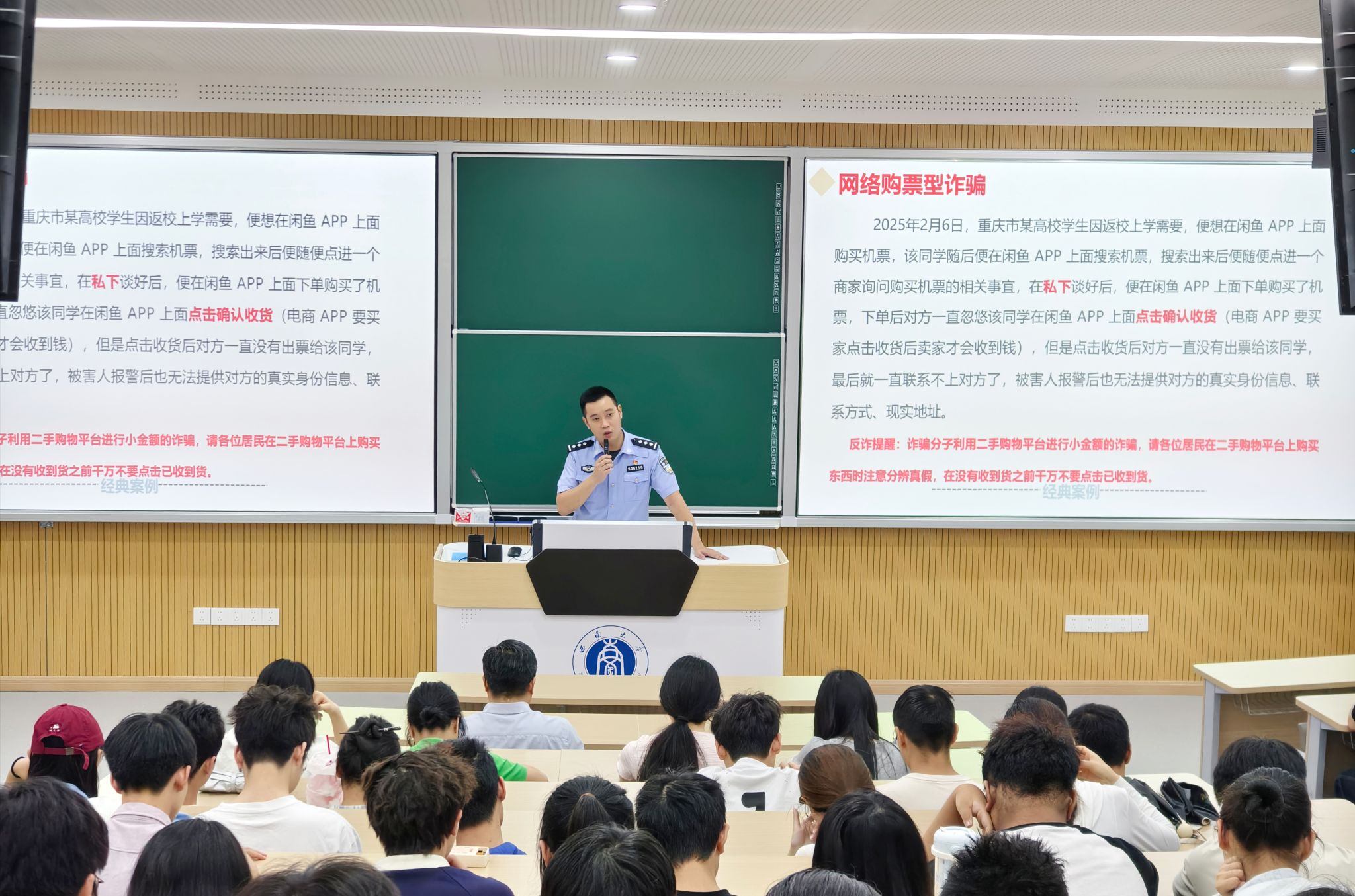 为筑牢防范电信网络诈骗的安全防线,培养理性防范思维,建设平安校园,5月16日,学院邀请天生派出所警长张又之、天生派出所民警刘佳在31教学楼209教室开展防范电信网络诈骗宣讲会。学院党委副书记、纪委书记王强,2024级本科生辅导员许淑雅及学院师生代表共计150余人参会。