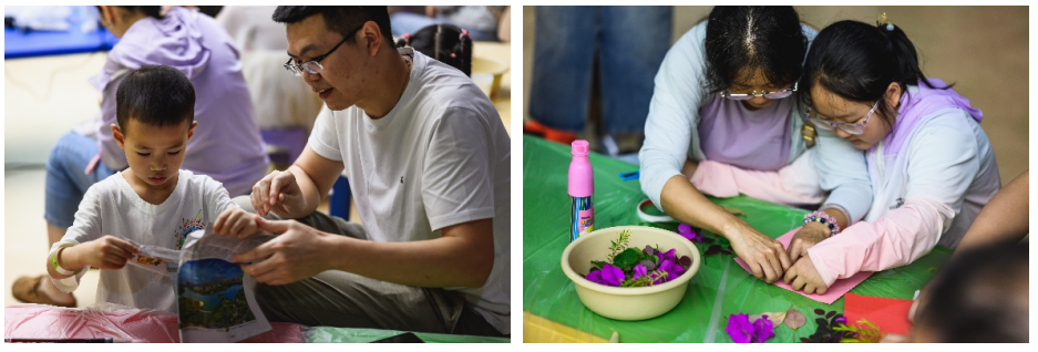 活动现场热闹非凡,16组7-10岁儿童家庭齐聚一堂。围绕植物生长周期,“种子山城”“花果香囊”“落叶拼贴画”“生态微缩景观” 四大实践环节依次展开。恰逢端午,“花果香囊” 环节特别准备了艾叶等传统材料,孩子们小手穿梭其中,将艾叶与多彩香料精心搭配,制作出一个个饱含节日韵味的香囊。此外,在“种子山城”里好奇探索种子奥秘,用落叶拼贴出儿童节的欢乐图景,共同搭建充满生机的生态微缩景观。