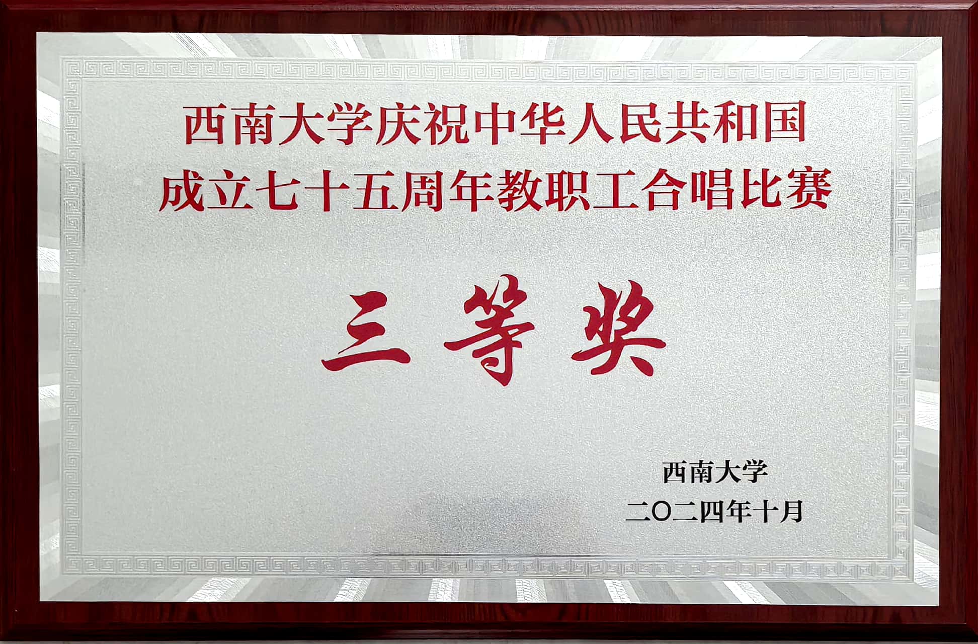 在新中国成立75周年、教师节设立40周年之际,为厚植爱国情怀,坚定理想信念,丰富教职工精神文化生活,促进校园文化建设,学校10月26日举办“凝心聚力促发展 奋勇争先建新功”教职工合唱比赛。在学院工会精心筹备下,参赛教职工齐心协力,在全校39个二级单位参赛队伍中脱颖而出,最终荣获合唱比赛三等奖。