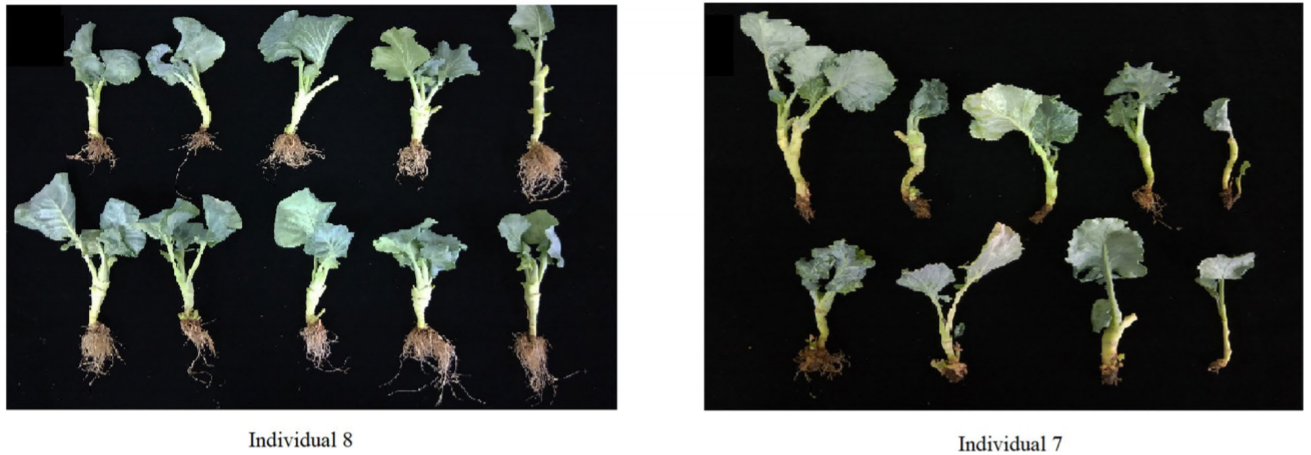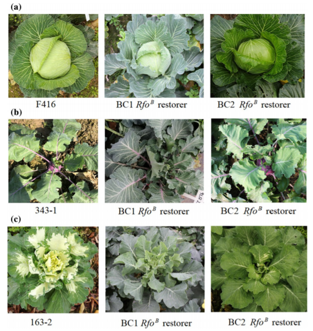 甘蓝类蔬菜包含结球甘蓝、花椰菜、青花菜、苤蓝、孢子甘蓝和芥蓝等不同变种,表型差异十分丰富。目前,Ogura CMS不育系已经成为甘蓝类蔬菜杂种优势利用最普遍的育种途径。Ogura CMS细胞质雄性不育基因位于细胞质内,位于不育材料(品种)中的优异性状无法被分离出来与其他优异性状进行组合而被再利用,形成优异种质资源再利用的技术封锁,阻碍甘蓝类蔬菜优异育种材料的创新。为了突破Ogura CMS不育系的技术封锁,研究所将来自萝卜的RfoB恢复基因优化后转入结球甘蓝中,创制了结球甘蓝Ogura CMS恢复系(图1),将该恢复系与不同类型的甘蓝类蔬菜杂交和回交创制了一系列(18种类型)甘蓝类蔬菜Ogura CMS专用恢复系(图2),并利用该恢复系成功转出了Ogura CMS品种GZ87的根肿病抗性(图3)。该研究彻底打破了现有国内外育种公司对基于Ogura CMS雄性不育系甘蓝类蔬菜优异资源的技术封锁,对推动整个甘蓝类蔬菜品种选育创新起到了重要的作用。