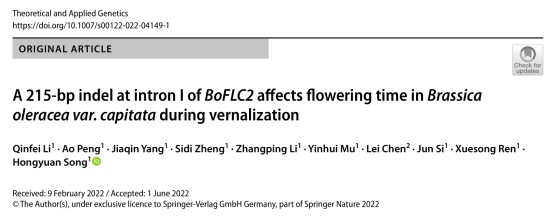 近日,pa视讯官方集团,PA视讯登录入口宋洪元团队在植物遗传育种领域国际知名杂志《Theoretical and Applied Genetics》在线发表了题为《A 215-bp indel at intron I of BoFLC2 affects flowering time in Brassica oleracea var. capitata during vernalization》研究文章,该项研究不仅提供了一种有效的耐抽薹分子标记辅助选择策略来鉴定结球甘蓝资源和促进新品种选育,也为探索绿体春化植物开花机制提供了切入点。
