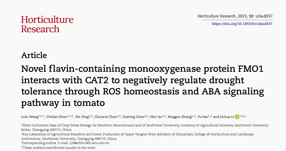 近日,李金华教授团队在Horticulture Research 上线了(Advance Access)题为Novel flavin-containing monooxygenase protein FMO1 interacts with CAT2 to negatively regulate drought tolerance through ROS homeostasis and ABA signaling pathway in tomato 的研究论文,该研究解析了一个新的黄素单加氧酶基因FMO1负向调控番茄抗旱性的分子机制。