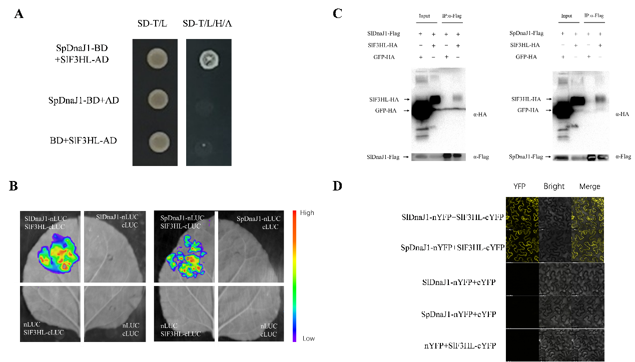 本研究发现野生种抗旱番茄潘那利中的SpDnaJ1与栽培种番茄SlDnaJ1在酵母中异源表达都能增强酵母细胞的氧化应激耐受性,其中SpDnaJ1比SlDnaJ1耐受性更强。将SpDnaJ1在普通栽培番茄中超量表达后能够显著提高番茄的抗旱性。通过酵母双杂筛库发现SpDnaJ1与SlF3HL互作,CoIP、LCA和BiFC实验证明SpDnaJ1与SlF3HL在体内外均能互作。超量表达SlF3HL提高植株耐旱性,而抑制SlF3HL表达后对干旱较敏感。此外,超表达SpDnaJ1和SlF3HL均能促进干旱胁迫下F3H的积累,进一步促进植株抗氧化能力。