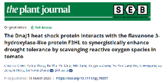 园艺植物发育与逆境生物学创新实验室李金华教授团队于3月16日在The Plant Journal杂志在线发表了题为“The DnaJ1 heat shock protein interacts with the flavanone 3-hydroxylase-like protein F3HL to synergistically enhance drought tolerance by scavenging reactive oxygen species in tomato”的研究论文。揭示了野生耐旱番茄潘那利(Solanum pennellii)热激蛋白SpDnaJ1提高栽培番茄抗旱性的分子机制。