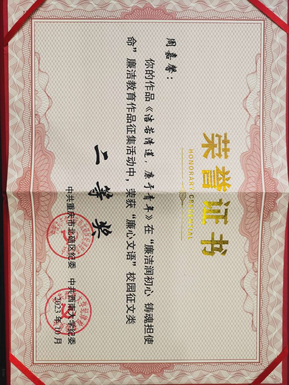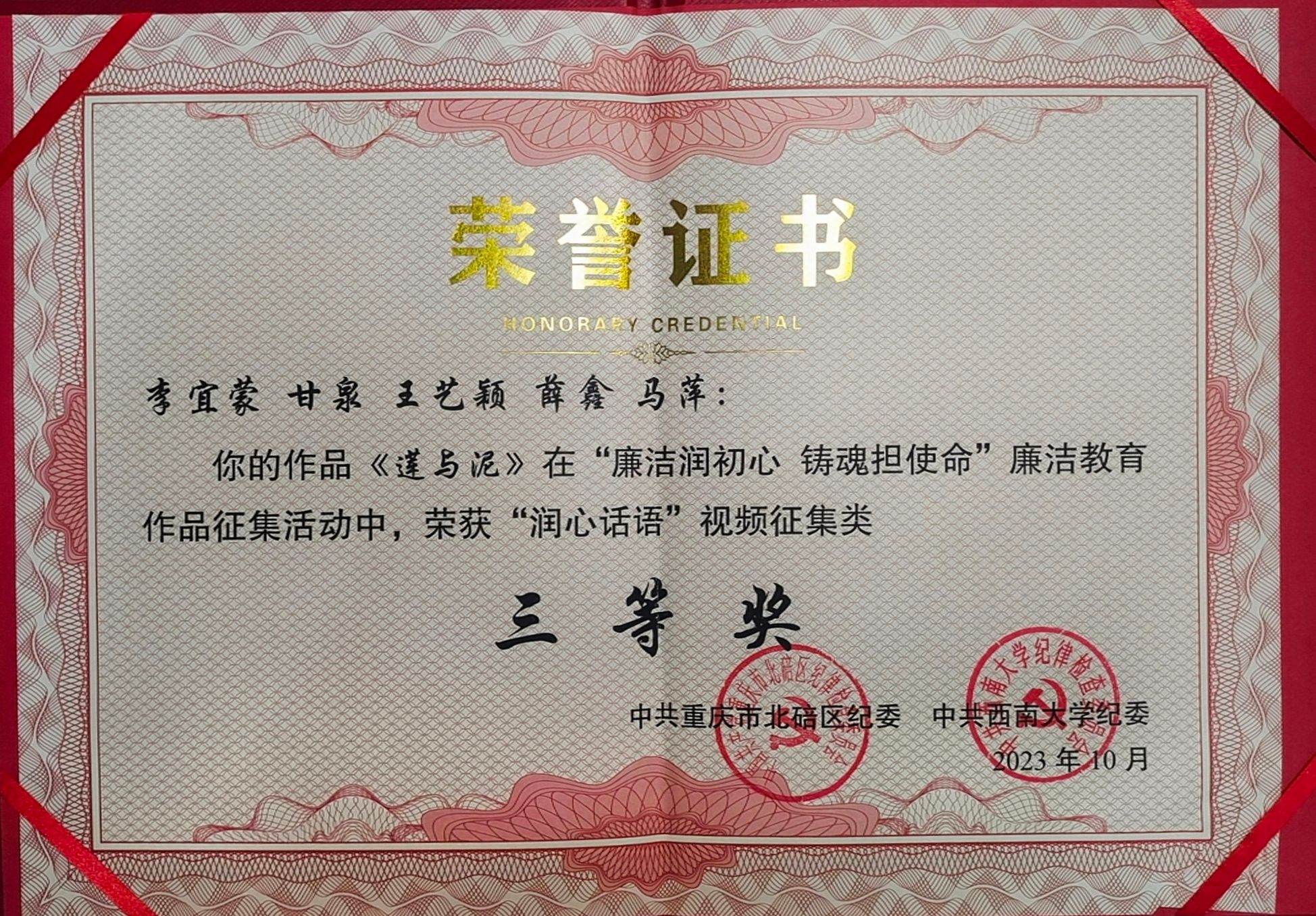 为深入学习贯彻党的二十大精神,贯彻落实党中央《关于加强新时代廉洁文化建设的意见》要求,围绕落实立德树人根本任务,纵深推进全面从严治党,重庆市北碚区纪委监委、PA视讯登录入口纪委组织开展了“廉洁润初心 铸魂担使命”廉洁教育作品征集活动。征集活动开展以来,学院纪委高度重视,鼓励师生开展形式多样的廉洁文化创作活动,并选送优秀作品参加征集。最终,周嘉馨作品《洁若清莲,廉于青年》获得“廉心文语”校园征文类二等奖,李宜蒙、甘泉、王艺颖、薛鑫、马萍作品《莲与泥》获得“润心话语”视频征集类三等奖。