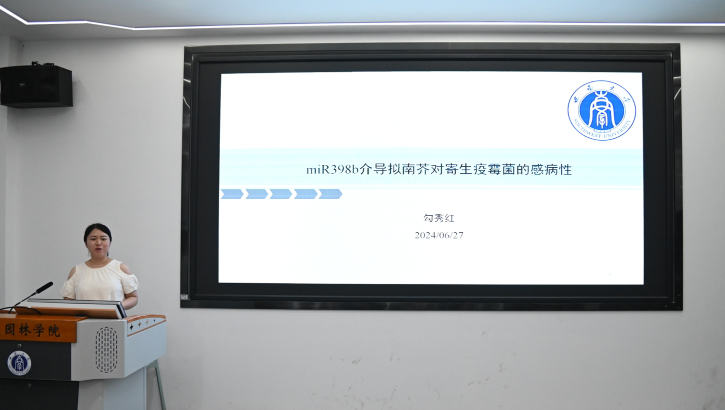 本期报告嘉宾为我院青年教师勾秀红。勾秀红以“miR398b介导拟南芥对寄生疫霉菌的感病性”为题,阐述了拟南芥内源miR398b通过调控植物免疫正调控因子AtC2GnT、CSD1和CSD2的表达,介导拟南芥对寄生疫霉菌感病性的作用机制。此外,还分享了有益微生物在提升枇杷抗病性中的探索性应用。在互动提问环节,勾秀红和与会师生就瞬时表达体系和稳定遗传转化体系在科研中的应用,以及植物与微生物的共进化进行了深入交流。